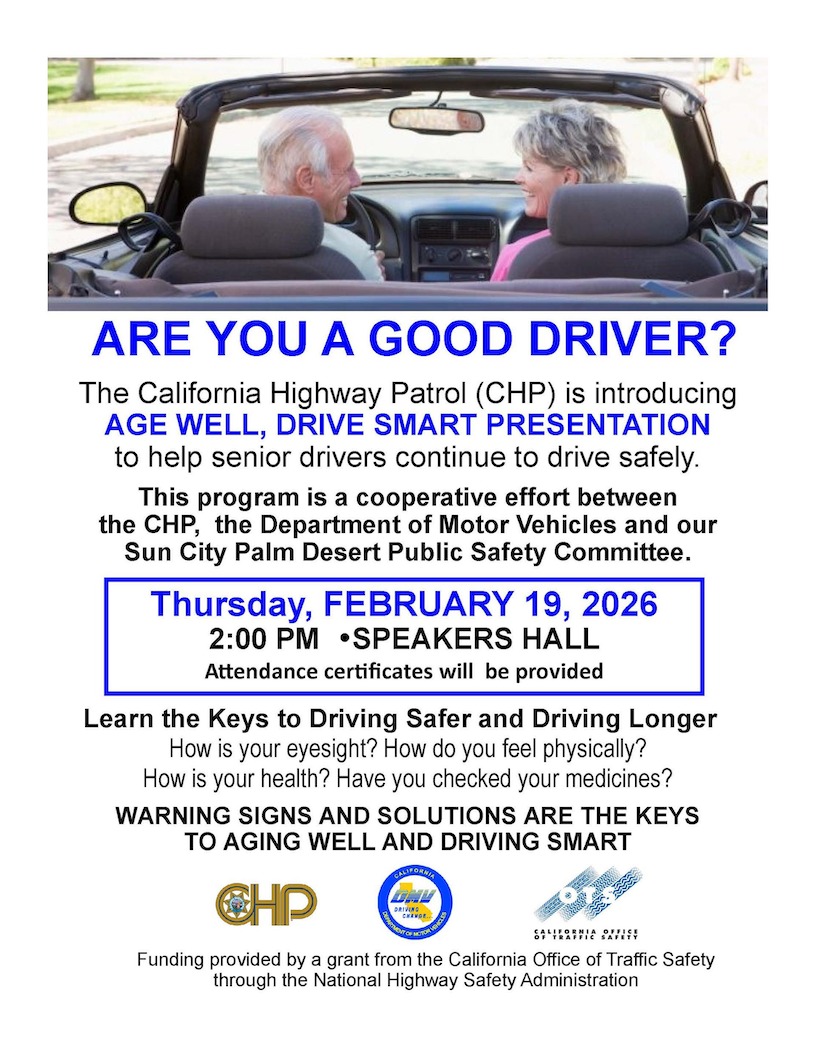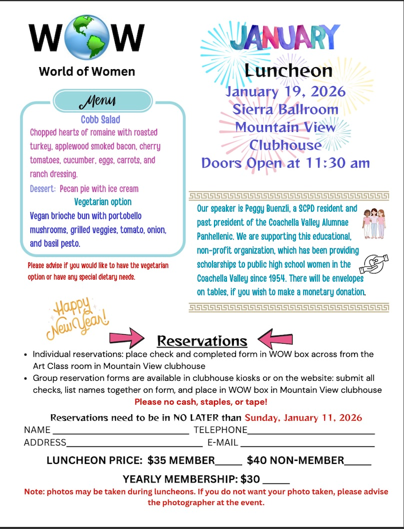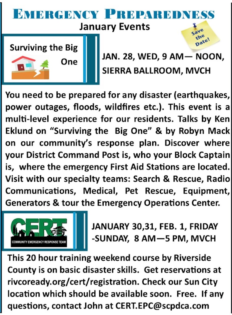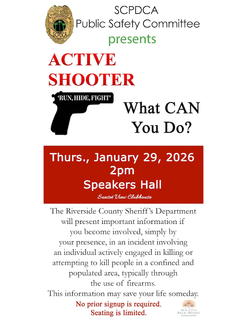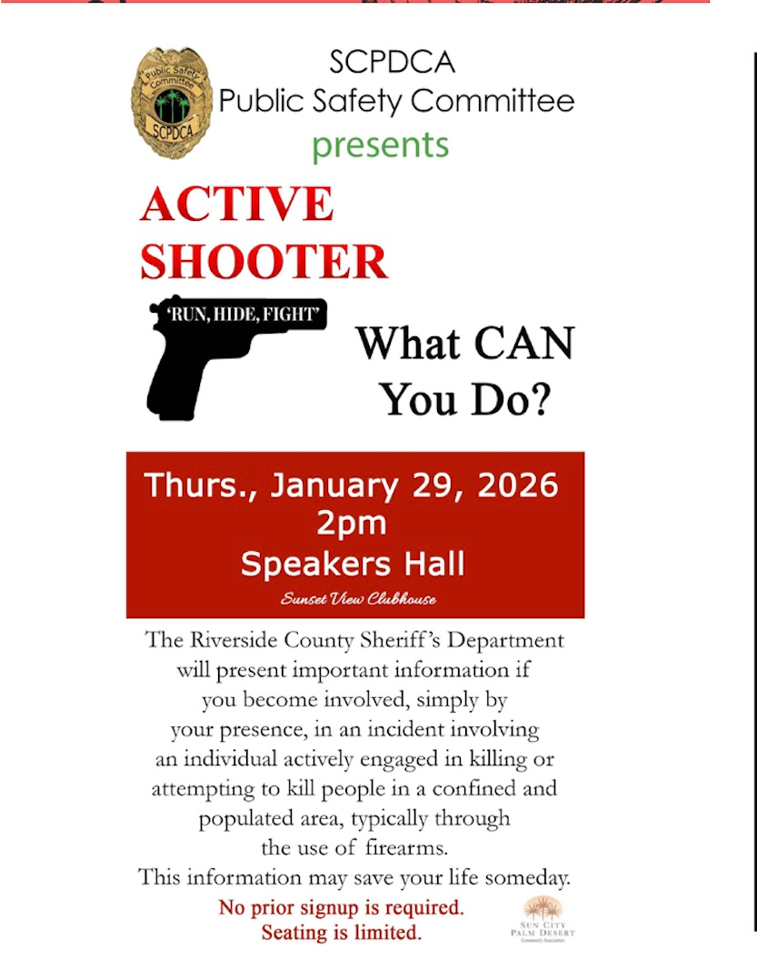 SCPD EVENTS PAGE Joel Effron July 21, 2025 Click any flyer to see larger version SCROLL ALL THE WAY DOWN TO SEE ALL THE FLYERS Mon Jan 19 Tues Jan 20 Jan 8 & 24 Wed Jan 21 Wed Jan 21 Thur Jan 22 Thur Jan 29 Jan 30,31 Feb 1 Jan 30, 31 Sun Feb 8 Thur Feb 19 Sat Feb 2/24 Wed Feb 25 To Return to the Sun City Palm Desert Home page CLICK HERE
